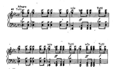 Прелюдируя, начинает солист. Мощные фанфары tutti (в их основе лапидарная последовательность аккордов I—IV—V—I ступеней) служат опорой виртуозным пассажам, которые охватывают весь диапазон фортепианной клавиатуры и с блеском подводят к проведению темы главной партии в оркестре: