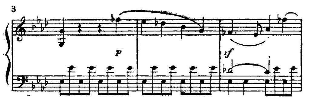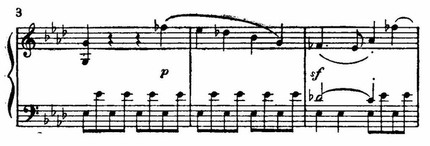 Разработка, начавшись главной партией, особенно широко использует материал побочной партии и синкопы, впервые появившиеся в связующей. Но из старых элементов возникают новые образные качества. Нисходящие фразы побочной партии (см. пример 3) теперь, благодаря упорным повторениям в правой и левой руках, получают характер тревожной, неотступной навязчивой идеи.