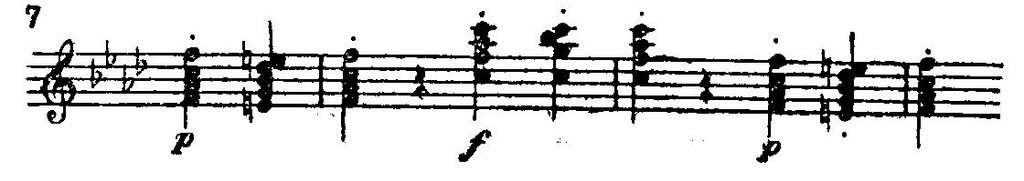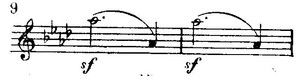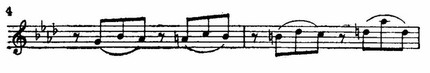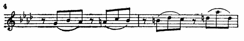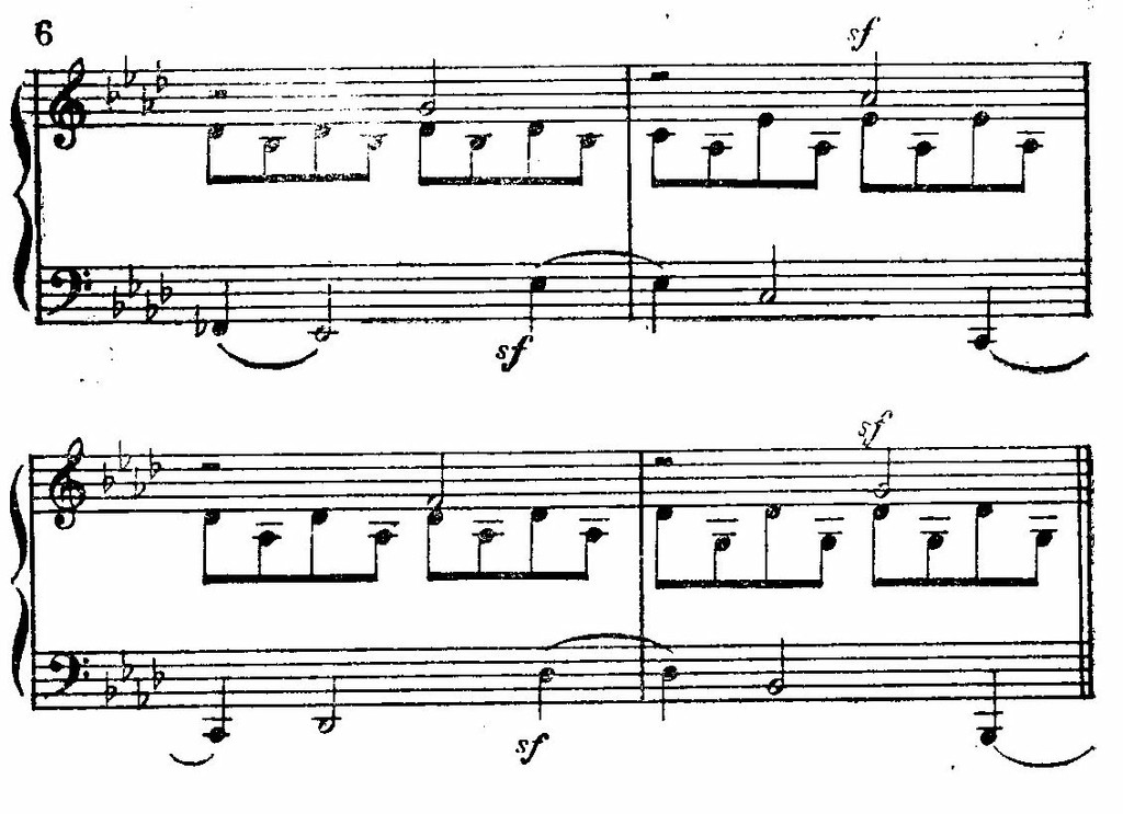 Беспокойство усиливается с момента вступления синкоп в басу и перекликающихся с ними восклицаний правой руки. Здесь перебивка ритмических акцентов настолько характерна и для позднейшего ритмического склада музыки Бетховена, часто полной неожиданных и резких контрастов, что мы приведем в виде образца небольшой отрывок: