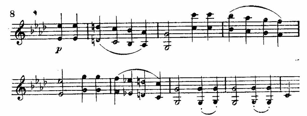 Но тем важнее почувствовать новые образные тенденции Бетховена. Легко улавливается зависимость всякого рода аккордовых тем от естественного звукоряда медных духовых инструментов. Однако, если в середине XVIII века и раньше подобные ходы по тонам аккордов чаще всего связывались с охотничьей музыкой, то в революционную эпоху Бетховена они получили иной выразительный смысл — «воинственно-призывный». Особенно существенно расширение подобных образных интонаций на область всего волевого, решительного, мужественного.