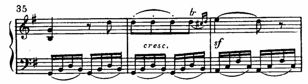 Третья часть (Scherzo, Allegro assai, G-dur) продолжает эту тенденцию увода от непосредственно вырвавшихся эмоций первой части. Мелкие шажки начальной темы скерцо: