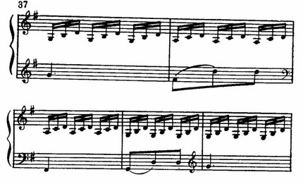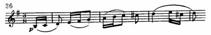 Сперва (тт. 1—7) порыв, взволнованные мелодические обороты и ритмические перебои которого, однако, быстро затихают в переходе к музыке, где все — ласка и нежность любовной речи: