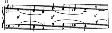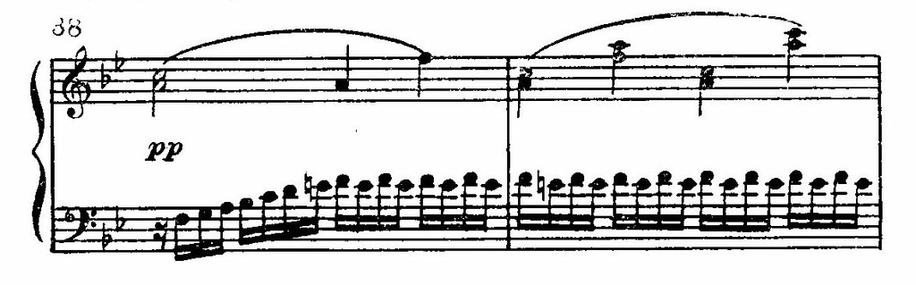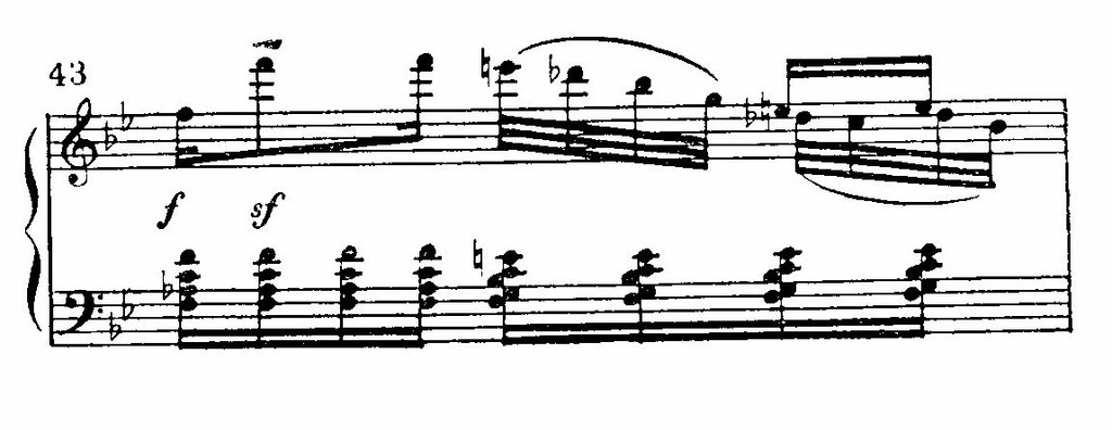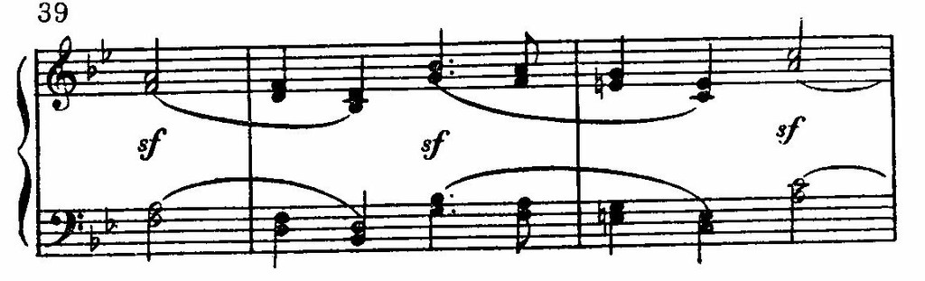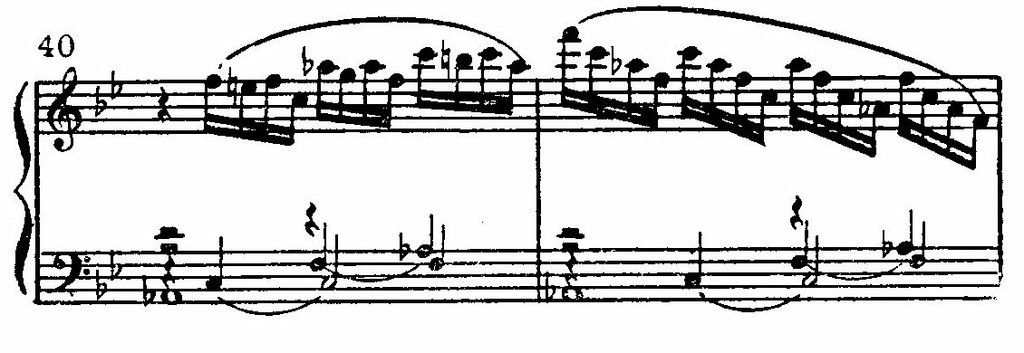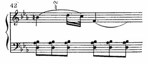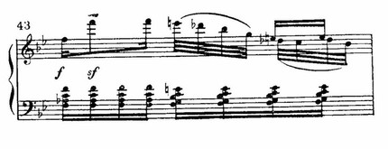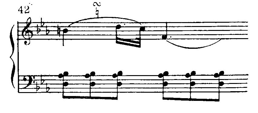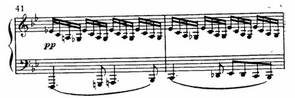 уже предчувствуется конечный фазис разработки первой части сонаты ор. 53. Более того, тут (как позднее в той же «Авроре») показаны две стадии образного фона — звонкая и глухая. К тому же второй элемент (пример 41) построен на итоговых фанфарных фигурах заключительной партии — этим оттеняется сюжетная связь фона с тематизмом.