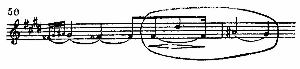 Побочная партия (т. 21 и д.) — новый фазис. Рокот шестнадцатых ушел в бас, стал фоном, а тема правой руки свидетельствует о появлении волевого начала.