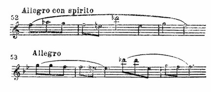 в своем «контексте» выражает стремительность и решимость. Не показательно ли сравнить с ним аналогичные по оборотам, но иные по характеру интонации сонат Гайдна и Моцарта (пример 51 — из второй части сонаты Гайдна Es-dur; пример 52 — из первой части сонаты Моцарта C-dur; пример 53 — из первой части сонаты Моцарта B-dur) (Гайдн здесь (как и в ряде других случаев) ближе к Бетховену, прямолинейнее; Моцарт — галантнее.):