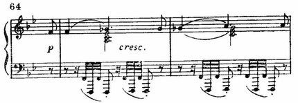 Чрезвычайно правдивы и последующие этапы экспозиции — бурный скат в бас, тяжелое торможение синкоп, патетический подъем и постепенное затихание, когда от всего порыва остаются лишь отголоски.