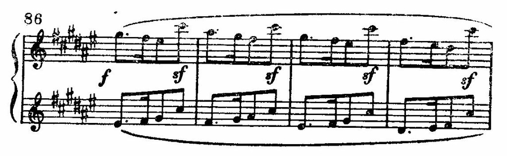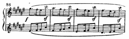 Но это еще не все. К интонациям речи присоединяется важнейший компонент органности и хоральности, дополняющий образ чертами благоговейной задумчивости. То одна, то другая сторона образа выступают на первый план (Так, эмоциональная напряженность господствует в т. 18 и далее, где использован верхний регистр и экспрессивные хроматизмы секундаккордов.). Временами они полностью сливаются. А временами остается лишь фон — таинственное журчание шестнадцатых и краткие отголоски фразок и аккордов (так — в большей части разработки или в конце репризы).