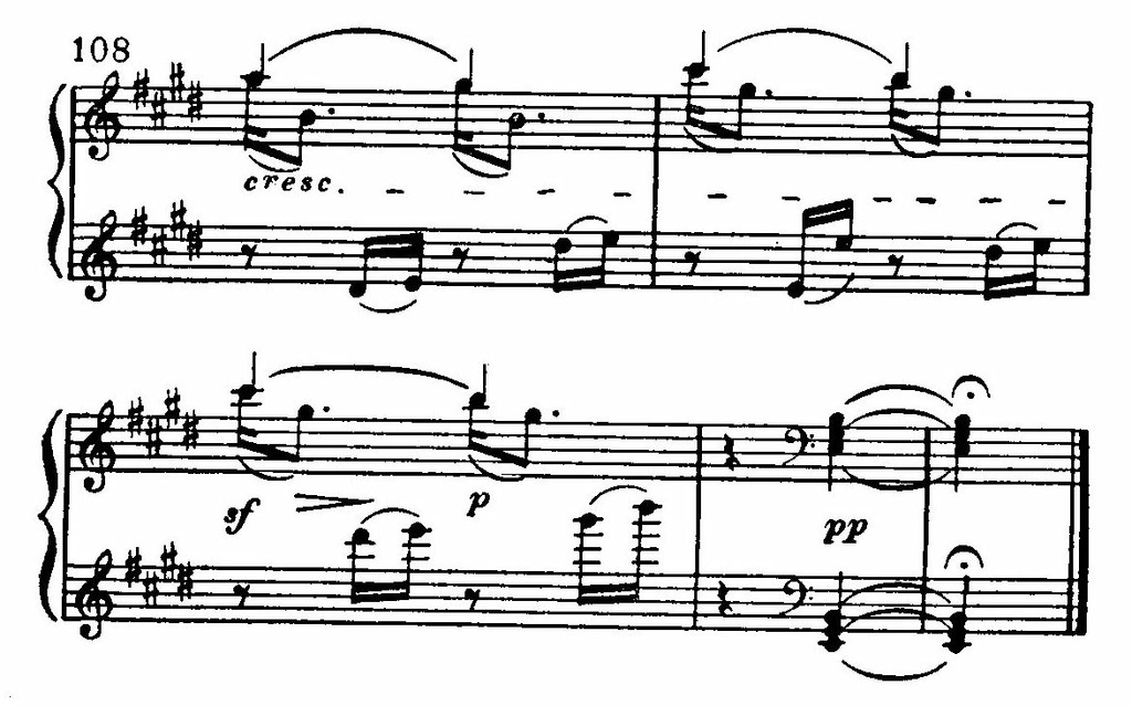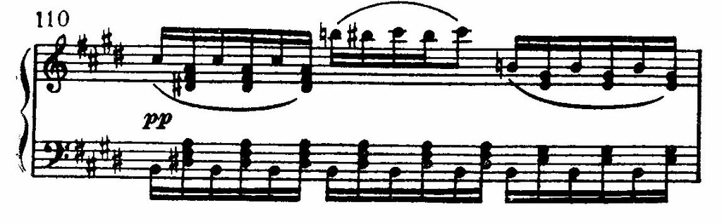 Вслед за этим — лирический подъем (где опять показательна опора на терции и квинты аккордов в мелодии). Но далее эмоциональный характер музыки ослабляется. Слышны лишь звонкие щебетания в высоком регистре и гулкие отголоски басовых разбитых октав.