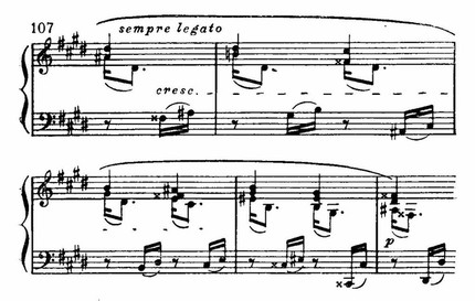 Первое из них легко, воздушно и излагается в характерном пунктированном ритме (Шестнадцатая и восьмая с точкой. Этот ритм имеет обширную традицию от клавесинистов до Дебюсси.), с выделением терций и квинт аккордов в мелодии; образное содержание этого начала пока не развернулось, но в нем уже улавливается нечто среднее между акцентами речи и звукописью природы.