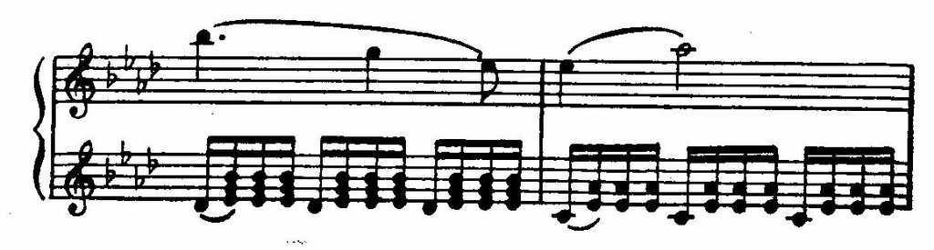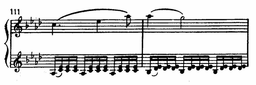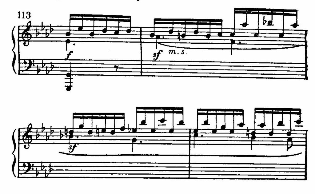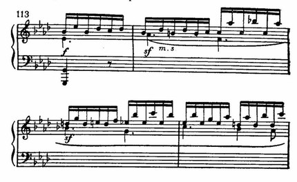 Разработка переходит в репризу еще незаметнее, чем экспозиция в разработку. Эта текучесть переходов — новое и симптоматичное явление. Вспомним, что Бетховен средней поры (особенно в «аппассионате») динамически преодолел «отгороженность» экспозиции от разработки и разработки от репризы — столь свойственную сонатным аллегро Гайдна и Моцарта. Но там (у Бетховена средней поры) связь была именно динамической, основанной на ясном различении и специфичности этих трех разделов сонатного Allegro. Здесь же мы имеем другое — связь получает пассивный характер, свидетельствует о сглаживании, растворении внутренних драматургических границ сонатной формы.