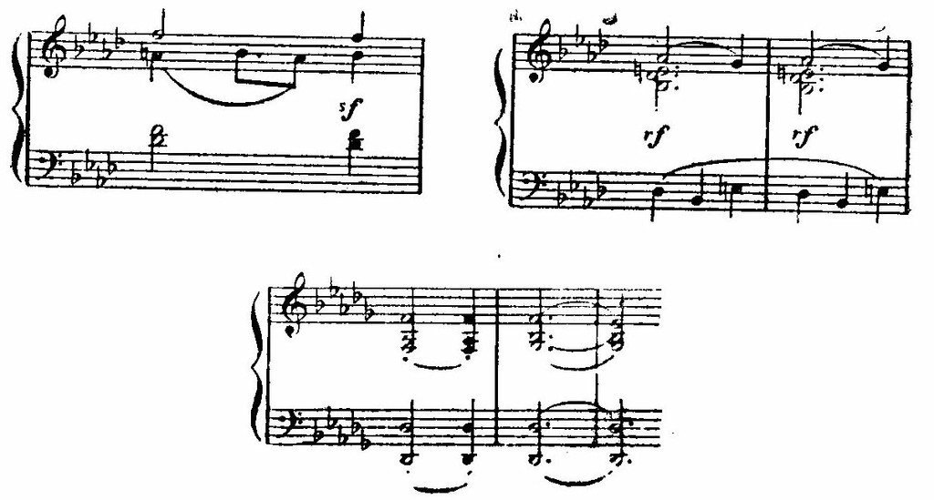 Увеличенное трезвучие в первом случае, излюбленный романтиками септаккорд из двух малых и одной большой терции —во втором случае, терцквартаккорд четвертой ступени в третьем случае — все они служат общим интонационным целям передачи вздохов и стенаний.)
