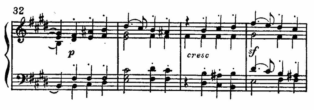 Несмотря на господствующее спокойствие, мы находим достаточно многочисленные оттенки эмоций. Например, в тт. 16—21 появляются интонации настойчивости и решительности. В фугированном эпизоде (т. 22 и д.) интонации не лишены суховатой рассудительности, но она вскоре сменяется (т. 39 и д.) ласковой просьбой. А в конце экспозиции — волевые акценты шестнадцатых баса и любопытное предварение оборотов Шумана