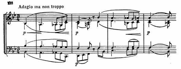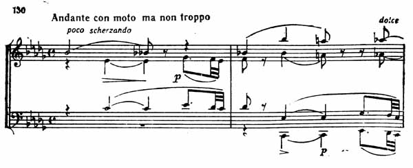 Andante — это замечательное лирическое излияние художника. Оно начинается в b-moll глубокими вздохами скорби (пример 130).