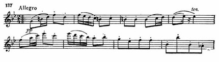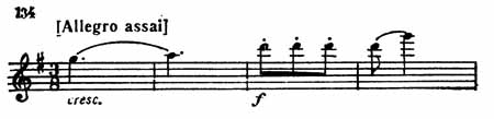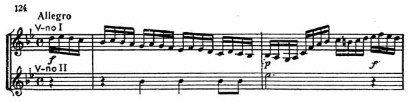 И вдруг в это серьезное настроение врывается движение Allegro. Сначала тема излагается первой скрипкой без сопровождения нижних голосов (пример 124).