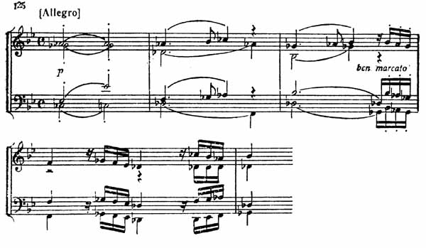 Теперь Allegro стремится вперед без всяких препятствий. Эта сначала беззаботная игра далее приобретает мужественный и энергичный характер. С каким искусством в конце Allegro композитор пользуется тихим хроматическим движением всех голосов в унисон, приходящим к звуку ре-бемоль — доминанте Ges-dur! В этой тональности у виолончели звучит вопрошающий мотив, образованный из фигуры начала главной темы Allegro. Этому мотиву с удивительной нежностью вторят остальные голоса. Возникает диалог (пример 125).