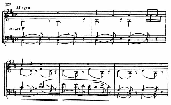 У альта и виолончели звучит тема, построенная на секундовых ходах из последнего Adagio; в сущности, можно говорить о двух темах, движущихся навстречу друг другу. У первой скрипки звучит «фанфара» ля — ре, в нее врывается вторая скрипка, исполняющая фрагмент «порхающего» мотива. Затем у виолончели появляется новая мелодия (такты 3—4 нотного примера 126). Таким образом, сразу звучат пять тем, самым необычным образом скомбинированных друг с другом. При этом все ясно, пластично, прозрачно, каждый голос отчетлив, и его легко проследить. Ритмические противоречия мотивов, повторяющаяся несколько раз зовущая интонация первой скрипки, медлительное движение нижних голосов, подвижная фигура шестнадцатых у второй скрипки и, наконец, выразительное пение виолончели — все это производит фантастическое впечатление, которое усиливается вследствие своеобразия инструментального колорита.