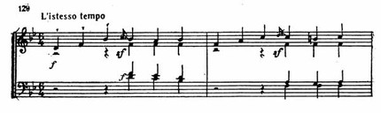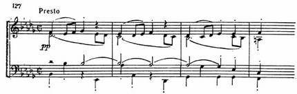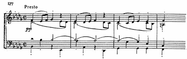 Приведенный пример дает ясное представление о фактуре Presto. Затем следует шеститактный период, по характеру музыки соответствующий первому (пример 128).