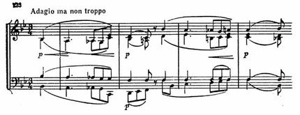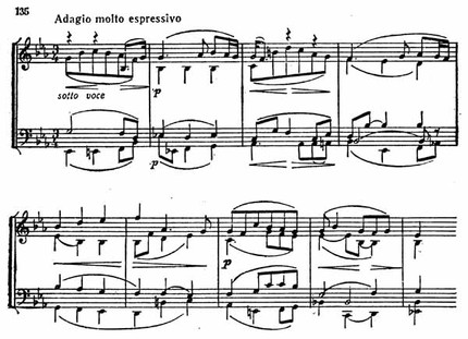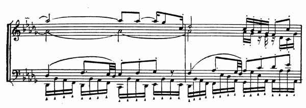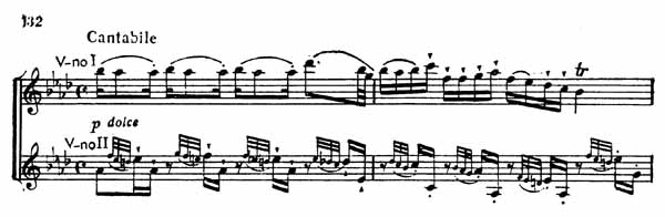 Широта и непрерывность мелодии достигается здесь главным образом заполнением цезуры скрипичной темы путем полифонического движения сопровождающих голосов.