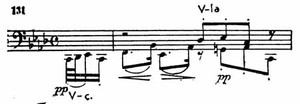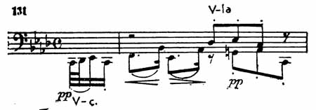 Слушатель уже настраивается услышать траурную, печальную музыку, как вдруг в такте 3 у альта совершенно неожиданно появляется четко ритмизованная веселая мелодия, сопровождаемая фигурой из отрывистых шестнадцатых виолончели. В такте 13 у виолончели появляется новый мотив, далее имитируемый первой скрипкой (пример 131).