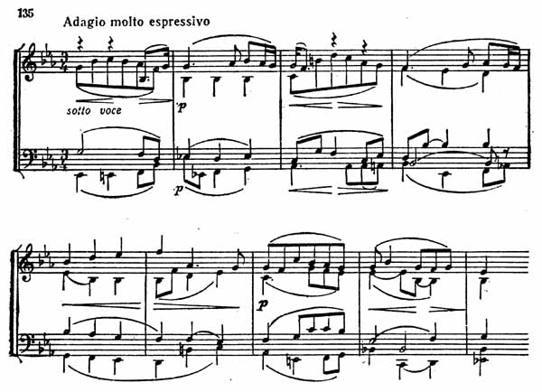В каватине звучит одна бесконечная мелодия (пример 135), вылившаяся из глубины души песня, которая трогает наше сердце буквально каждой своей нотой.