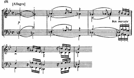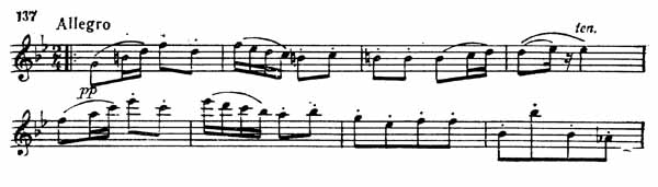 После двух вступительных тактов — октавных скачков альта — первая скрипка исполняет pianissimo главную тему народного характера. Она начинается в доминанте c-moll и через четыре такта переходит в доминанту B-dur, лишь в восьмом такте как бы мимоходом случайно задевая тонику главной тональности. Таким образом, тема эта (пример 137) тонально неустойчива.