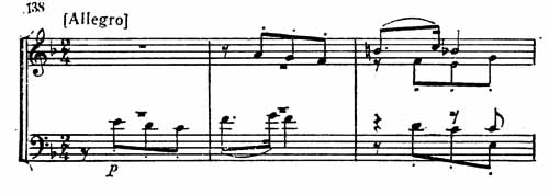 Если слушатель удержит в памяти эту главную тему, то весь финал окажется ясным, так как он интонационно целиком построен на ней. Мы здесь опять имеем пример того, как часто Бетховен в своих последних произведениях исходит из одной музыкальной идеи. Отдельные фрагменты темы являются звеном, осуществляющим переход к широкой, свободной, игриво-легкой связующей партии. Этот раздел в мелодическом и ритмическом отношении несколько напоминает Гайдна. Имитации виолончели и первой скрипки открывают собой побочную партию сонатной формы (пример 138).
