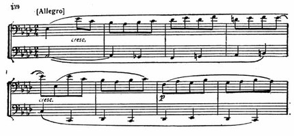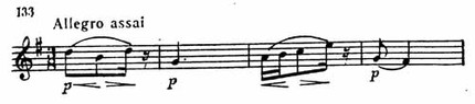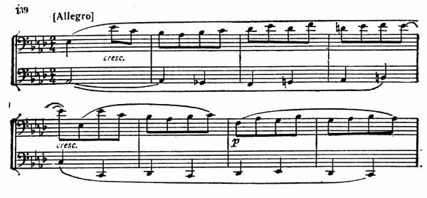 В разработке бетховенские черты проявляются ярче и неожиданнее. Отдельные фрагменты главной темы ритмически преобразуются: восьмые превращаются в шестнадцатые, а шестнадцатые в восьмые; первая скрипка, замедляя движение, как бы спрашивает: «Ну что же дальше?» Ответом на этот вопрос является появление эпизода в As-dur (пример 139), певучие и благородные очертания которого контрастируют плясовым прыжкам основной темы.