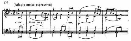 Следующие восемь тактов приобретают глубоко серьезный, скорбный характер. В тактах 23—25 вступает вторая главная мелодия каватины, в которой как бы слышится полный упрека вопрос: «Почему?» (пример 136).