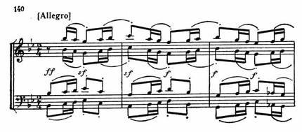 Вторая особенность заключается в аккомпанементе, проводимом нижними голосами: три ноты в каждой второй половине такта. При крайне возбужденной и вместе с тем однообразной ритмике, при резких акцентах на относительно сильной доле такта это трио производит впечатление какой-то демонической музыки.