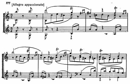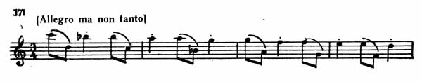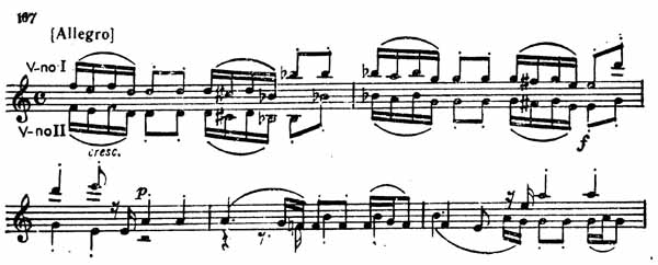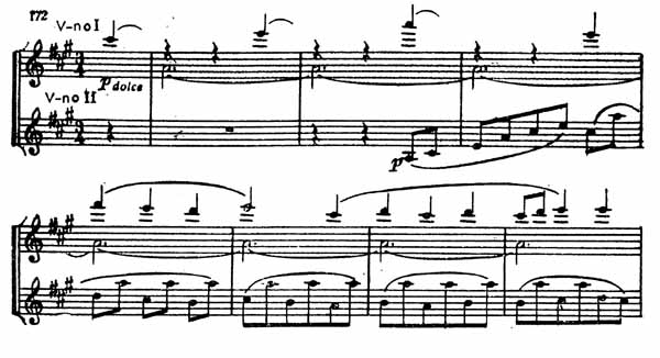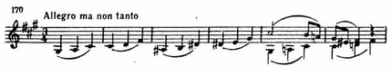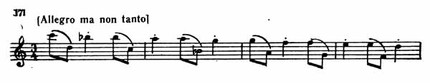 Очевиден контраст между первой и второй частями темы. Во второй части чувствуются то внутреннее волнение, то юмористический каприз, например там, где первая скрипка преобразует главный мотив и развивает его дальше (пример 171).