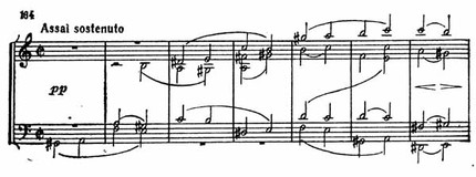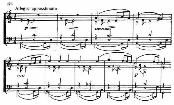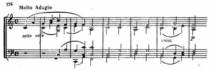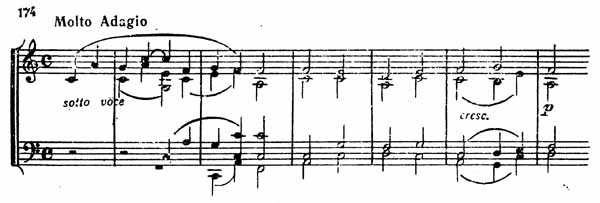 Главную часть этой «Благодарственной песни» составляет хорал в духе Палестрины, производящий глубочайшее впечатление отрешенности от мира. Он начинается sotto voce, и затем звучность слегка усиливается при помощи сдержанных crescendo лишь для того, чтобы снова упасть до piano (пример 174).