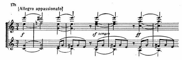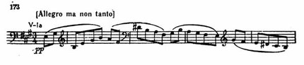 С такта 5 у виолончели начинает звучать фигура, заимствованная из первой темы этой части. Ее поддерживают протяжные аккорды в других голосах (пример 178).