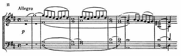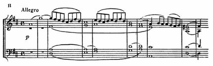 В первой части (Allegro, alia breve, половинная по метроному = 120), напоминающей квартет № 1, D-dur Моцарта, доминирует первая скрипка. Главная партия начинается piano, широким мелодическим ходом на септиму (пример 11).