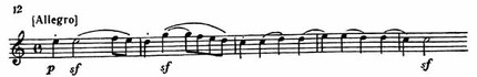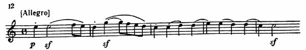 В побочной партии этой части две темы: первая начинается в доминантовой тональности A-dur; вторая, песенно-танцевального характера — в отдаленной тональности C-dur (пример 12).