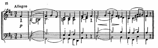 Близко примыкает к настроению первой части квартета полная очарования третья часть (Allegro, 3/4, половинная с точкой = 100), написанная в характере менуэта (см. пример 15).