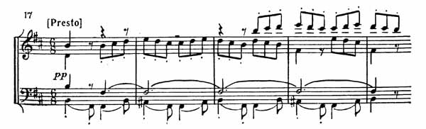 В разработке с начала ее и почти на протяжении полусотни тактов происходит преимущественно развитие мотива темы главной партии в разных вариантах. Затем появляется новый эпизод, который следует отметить: в партии второй скрипки в контрапункте с первой возникает новая тема, а виолончель в это время исполняет тему побочной партии (см. пример 17).