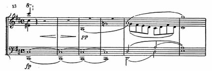 Разработка невелика по масштабам и не содержит интенсивного мотивно-тематического развития, столь характерного для Бетховена. Следует отметить интересный в гармоническом отношении переход к репризе: альт и виолончель удерживают основной звук установившегося в конце разработки Cis-dur'ного трезвучия, а скрипки на этом фоне вводят в тональности D-dur тему главной партии (пример 13).