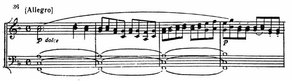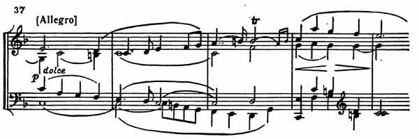 Пасторальная побочная партия (пример 37) по настроению родственна теме главной партии.
