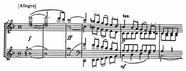Игра двух уже так хорошо запомнившихся фраз приводит к триумфальной кульминации главной партии, построенной на соединении обеих фраз. В тональности f-moll появляется побочная партия песенного характера (пример 41).