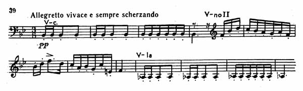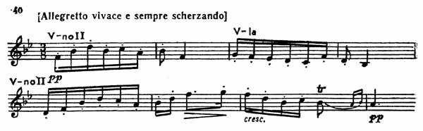 Главная партия этой части состоит из двух чередующихся фраз (пример 39), изложенных в виде четырехтактных сольных выступлений каждого из инструментов.