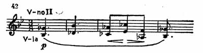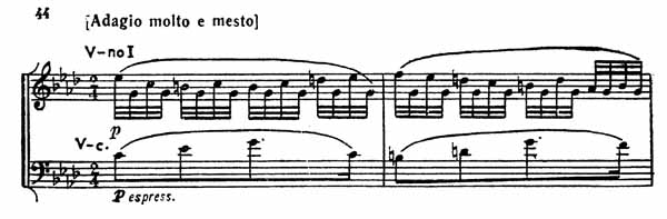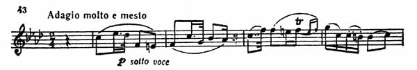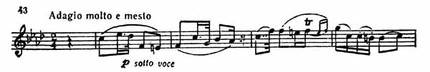 Тихо и робко, вполголоса (sotto voce) звучит у первой скрипки прекрасная, проникновенная, по своему складу несколько напоминающая русский романс тема главной партии (пример 43).