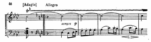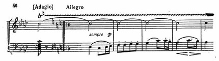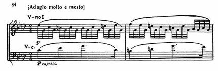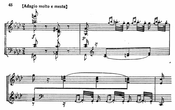 Эта тема при всей своей простоте воспринимается как нечто монументальное, мужественно-скорбное. Страстное, все более бурное движение резко обрывается на уменьшенном септаккорде VII ступени c-moll. Но только в заключительной партии окончательно утверждается трагическое настроение (пример 45).