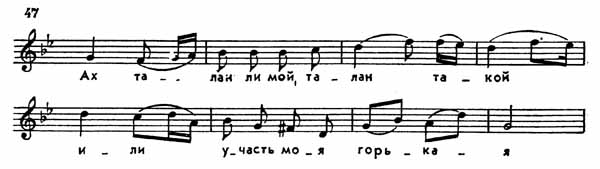 Как и следовало ожидать, Бетховен заставляет инструменты (виолончель и скрипку) по очереди петь всю песню целиком, а кроме того, подвергает „Theme russe" сокращению и расчленению, пользуясь отдельными ее частями. Ему, очевидно, понравились три следующие попевки: