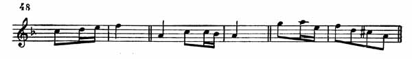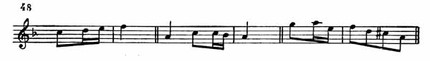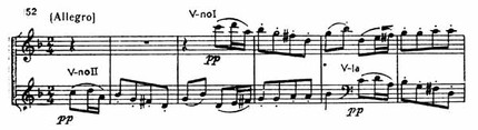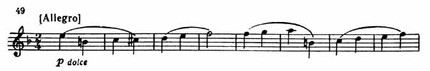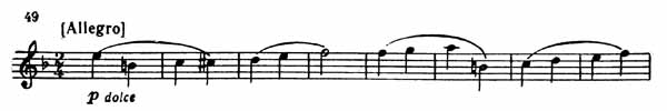 Русская тема, явившаяся первоначально у виолончели, вскоре переходит к первой скрипке, а затем в средние голоса. После модуляции в C-dur вторая скрипка начинает тему связующей партии (пример 49).