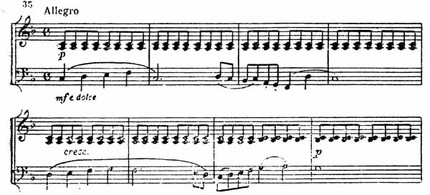 Уже начало первой части (Allegro, 2/4, половинная по метроному = 88) необычно (пример 35). «Мелодия звучит на фоне однообразного сопровождения, напоминающего звуки волынки. Гармонизация простой смелой диатонической темы отличается жесткостью; мелодия и аккомпанемент как бы независимы друг от друга. С девятого по девятнадцатый такт сопровождение держится сплошь на доминантсептаккорде, в то время как мелодия, очевидно, требует смены гармонических функций. Такой род сплошного недифференцированного сопровождения на одной и той же тональной функции в корне разрушает все сложившиеся со времен генерал-баса приемы гармонизации. Оно явно заимствовано из практики народных инструментальных ансамблей и придает особо рельефный характер самой мелодии — обычно танцевальной. Подобной смелости в применении народных приемов не проявлял еще никто до Бетховена. В частности, для утонченного, взращенного в аристократических салонах квартетного жанра начало квартета ор. 59 № 1 равносильно революционному перевороту: оно сдало в архив истории все галантные традиции во имя нового содержания.