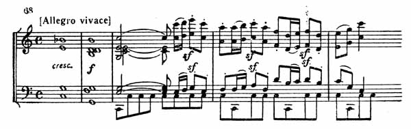 При повторении этой темы чувствуются возникшие еще в начале Allegro робость и сомнение. Но неожиданно мужественная воля разбивает все препятствия; простая модуляция приводит в основную тональность, появляется торжествующая тоника C-dur, и в главной партии звучит «мотив триумфа» (пример 68).