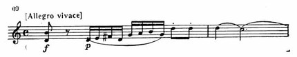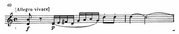 Затем тихо вступает сонатное allegro (Allegro vivace, 4/4, половинка = 88). Тема главной партии излагается первой скрипкой (пример 67).