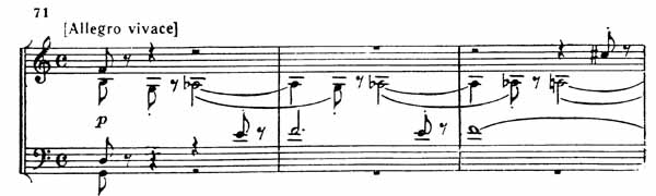 После этого появляется тема, полная сомнений. Она тянется четыре такта сначала тихо, робко, а затем освобождается от печали (пример 71).