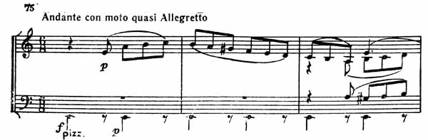 Andante начинается глухими ударами pizzicato у виолончели, к которым остальные три верхних голоса совсем тихо присоединяют свою песнь (пример 75).