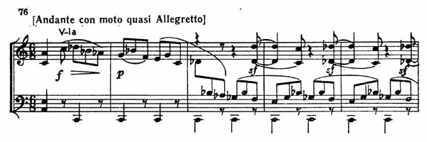 В звуках этой песни слышится жалоба, пришедшая, чтобы растрогать чужие сердца. Ко второй теме ведут свободные преобразования первой темы у альта (пример 76).